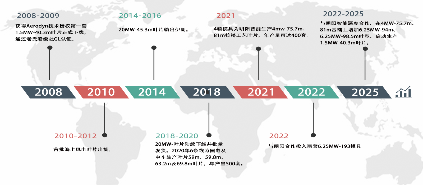 建厂至今叶片销售超2000套,国内订单覆盖全国21个省,国外订单主要销往韩国、乌克兰、塞舌尔、厄瓜多尔等地,在国内、国外叶片市场享有良好的声誉。公司目前主要生产98.5米叶片,为东三省陆上最大的风力发电机组叶片。
